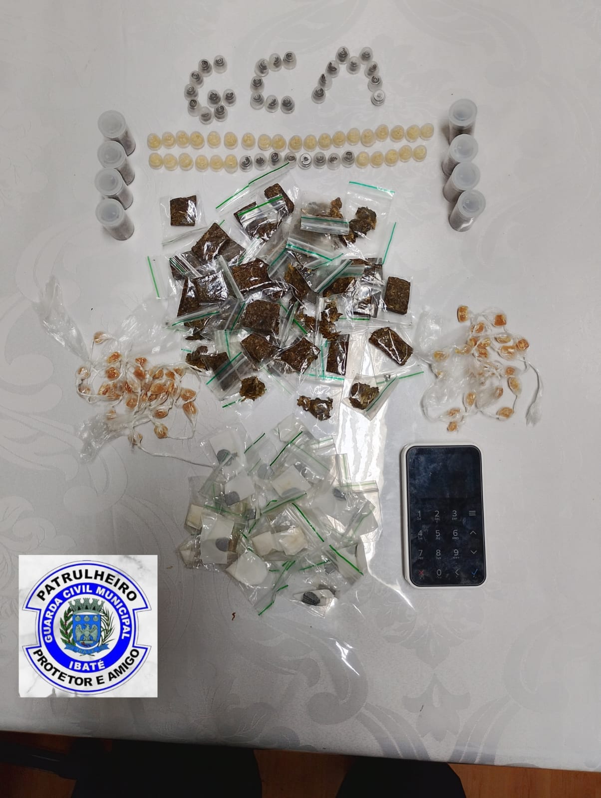 Na noite de 28/03, a Guarda Civil Municipal de Ibaté localizou entorpecentes em um terreno baldio na Rua Tabatinga x Benedito Barreto, Jardim Cruzado. Após denúncia, foram encontrados 53 porções de maconha, 81 de crack, 33 de haxixe e 26 de Ice Dry, além de uma máquina de cartão. O material foi encaminhado à Delegacia de Polícia de São Carlos e permanece à disposição da Justiça.